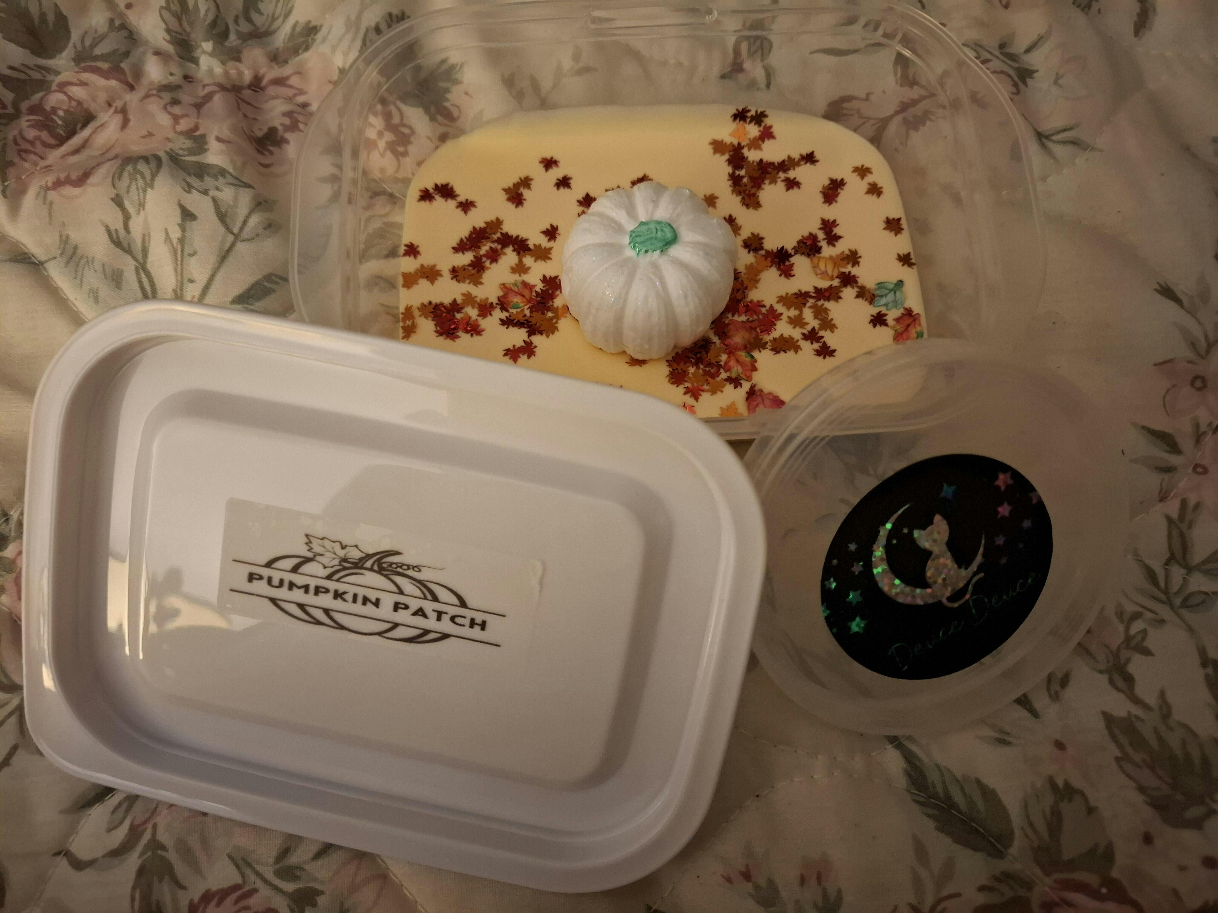 5oz wood glue slay with leaf mix and clay pumpkin. Scented pumpkin cheesecake.