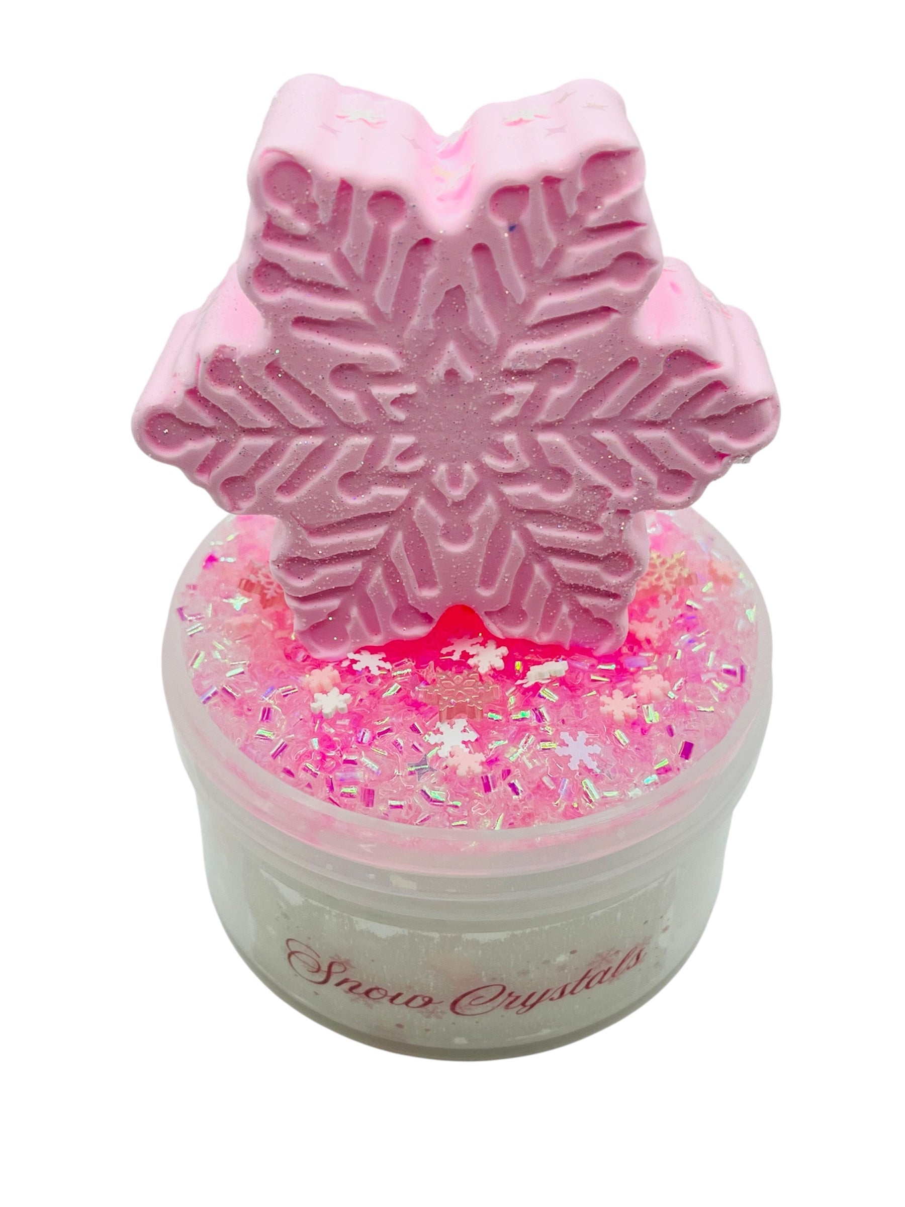 White glue lightly packed snowfiz base, 2oz bingsu topper, clay snowflake. Scented twisted peppermint, toasted marshmallow, sugar cookie and buttercream. Gets to twice its size. Did notice 3 bingsu pop out with prolonged play but nothing drastic.